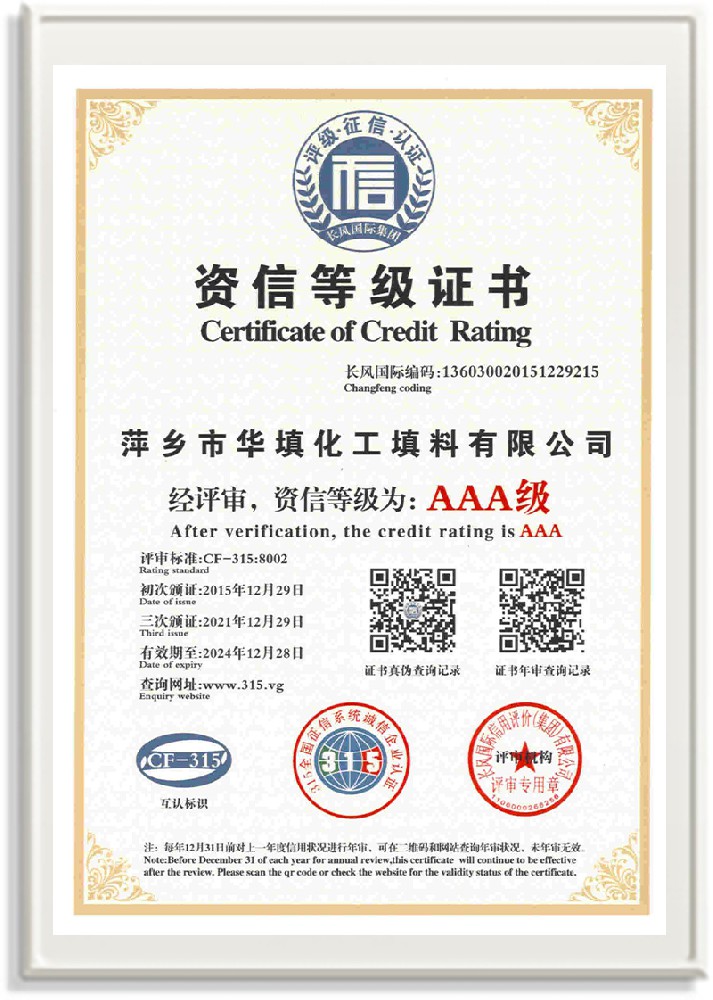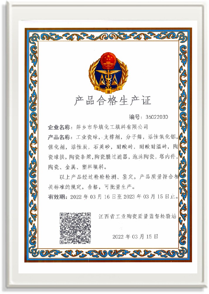 萍鄉市華填化工填料有限公司,位于320國道、109國道、浙贛鐵路、昌金高速公路貫穿其中,交通便利,是江西西部一顆燦爛明珠,創建于20世紀70年代初期,是中國石油天然氣股份有限公司“能源一號網”會員企業、中國石化物資采購電子商務網絡和中國海洋石油總公司采辦業務系統成員單位,是上海大學江西材料基因組工程產業研究院工業陶瓷產業創新聯盟基地,且通過ISO9001:2015質量管理體系、ISO14001:2015環境管理體系、ISO45001:2018職業健康安全管理體系認證的化工填料生產企業。公司擁有陶瓷、塑料、金屬填料、催化劑、活性氧化鋁、分子篩等產品生產線,現有固定資產3616萬元,占地面積3.8萬平方米。公司具有悠久的生產歷史、雄厚的技術力量和先進的生產工藝設備,可生產工業瓷球(支撐劑)、陶瓷、金屬、塑料質的規整、散堆化工填料及分子篩、催化劑、生化濾料、活性氧化鋁、石化助劑、活性炭、環保材料、耐火材料等系列的200多種規格型號產品。